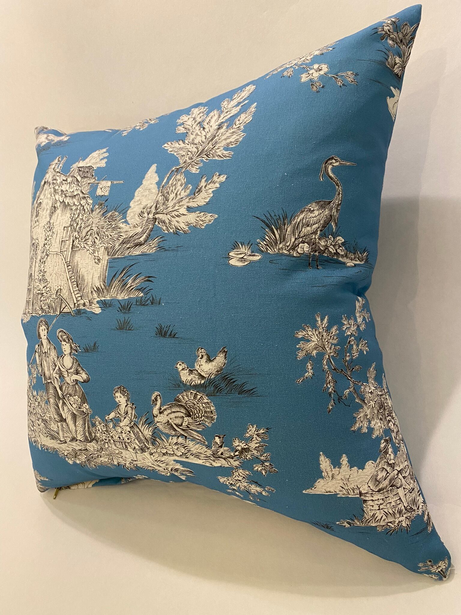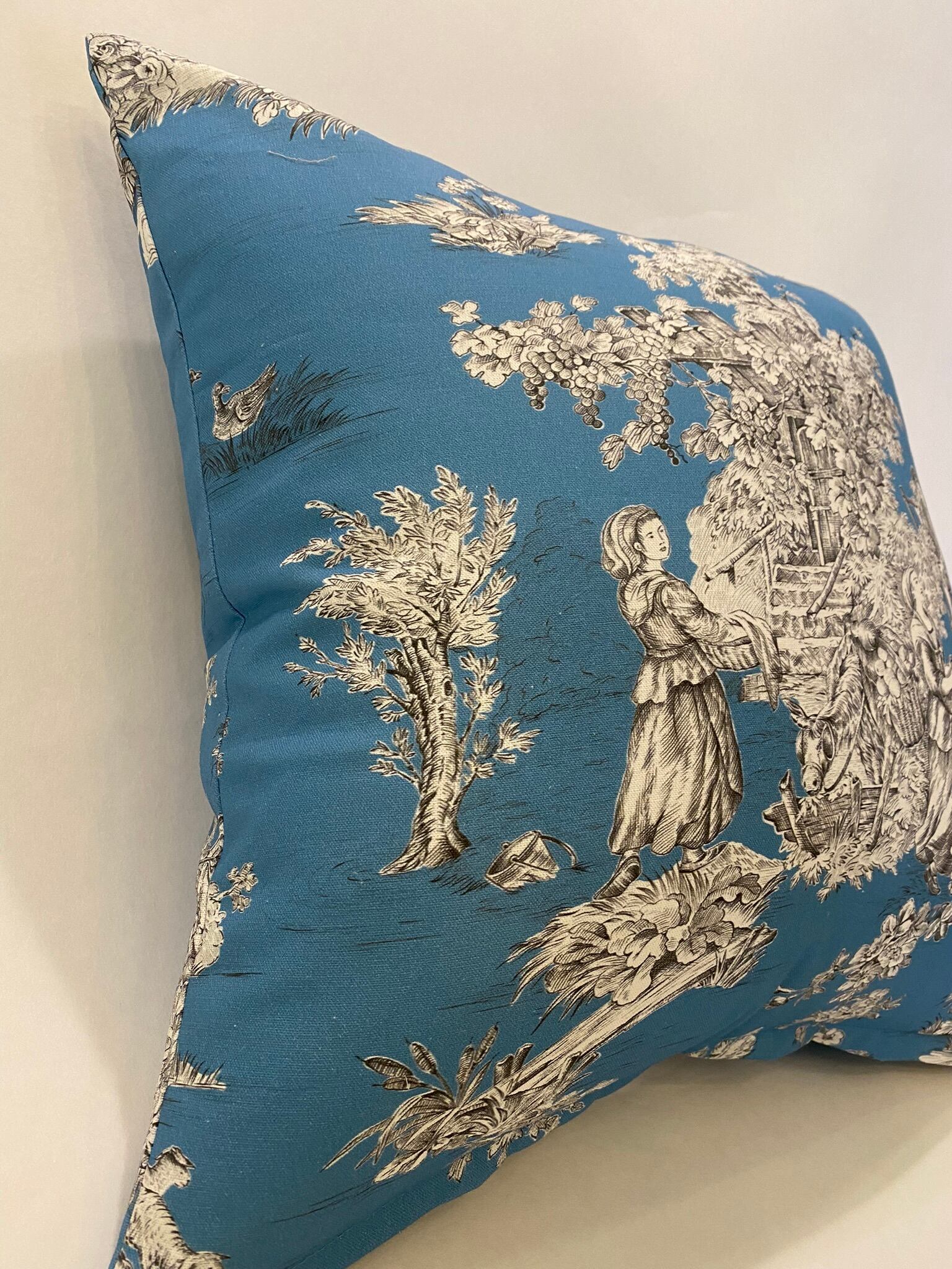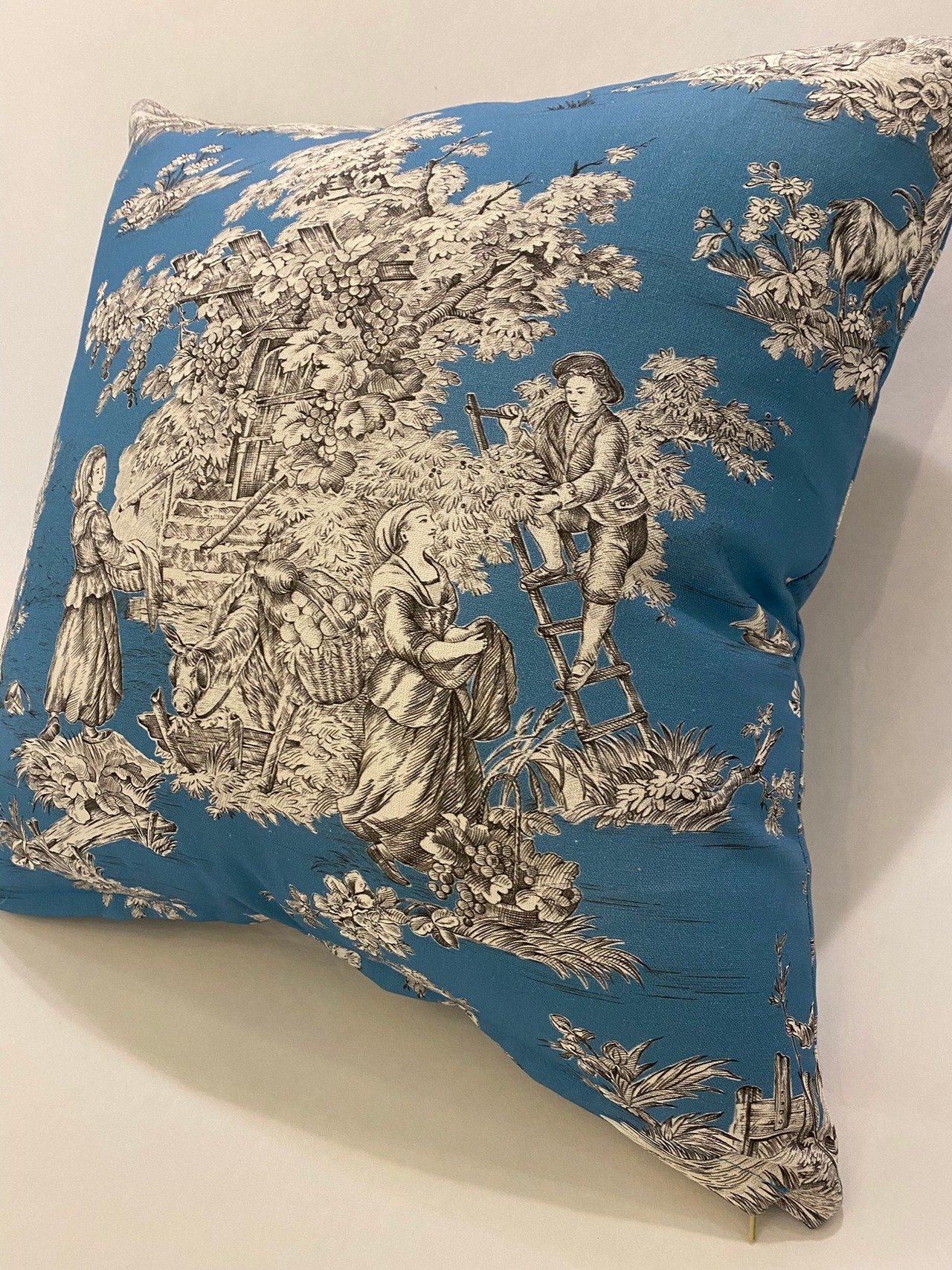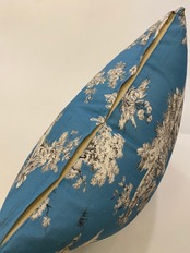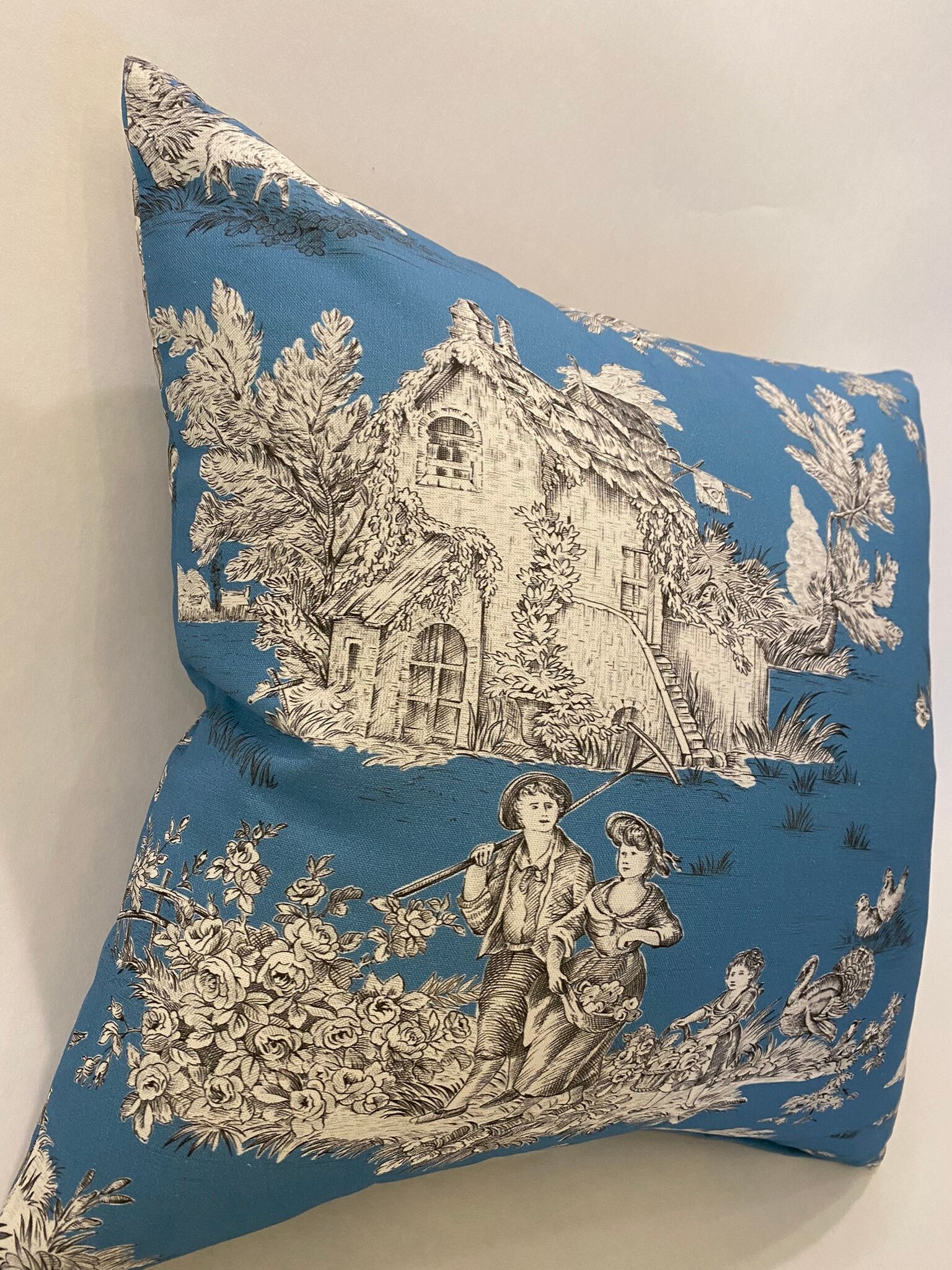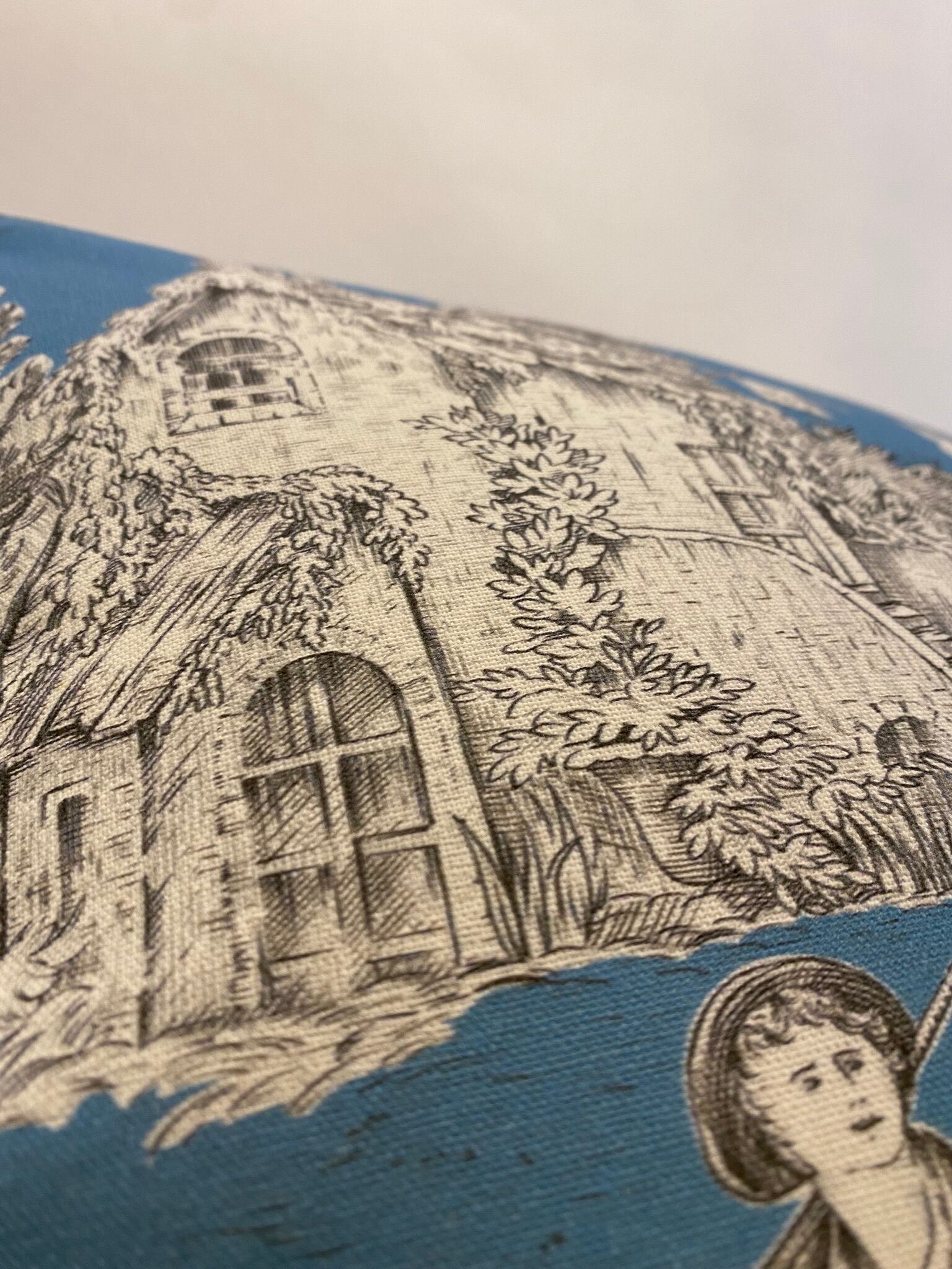 フランスのプリントメーカーmftaの生地で作ったクッションです。18世紀ごろの風景をモチーフにしたフランスの伝統的デザインのファブリックです。両面とも同じ生地です。