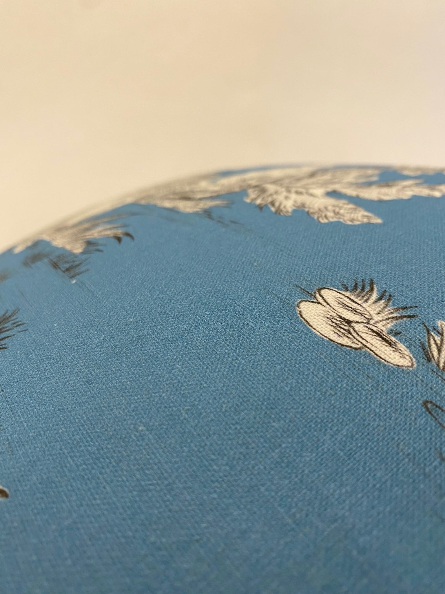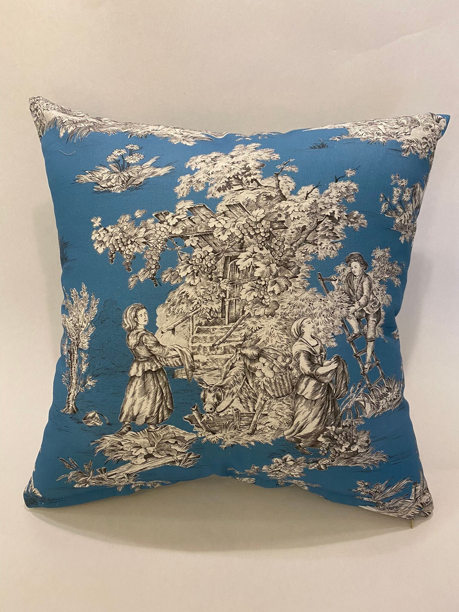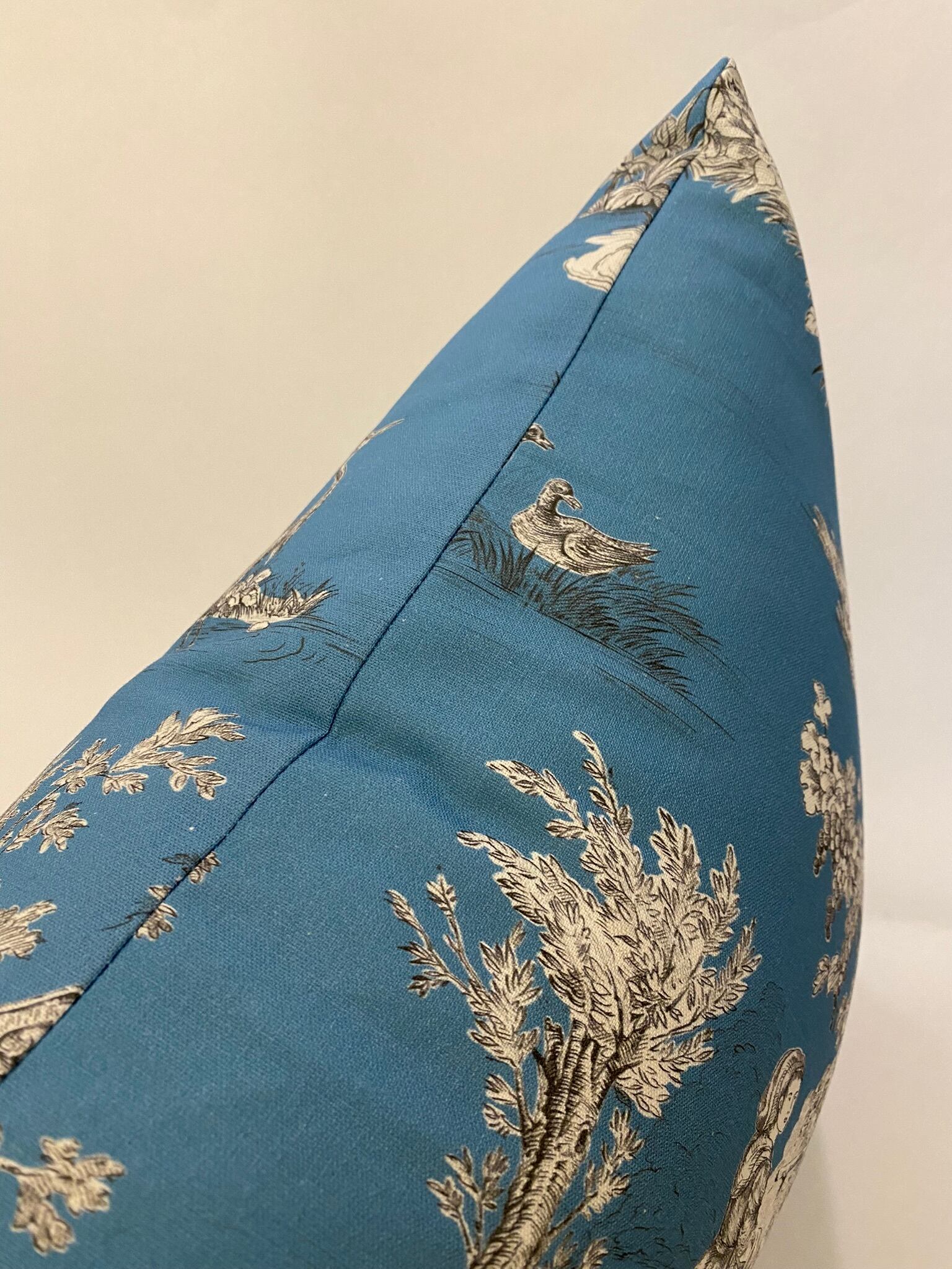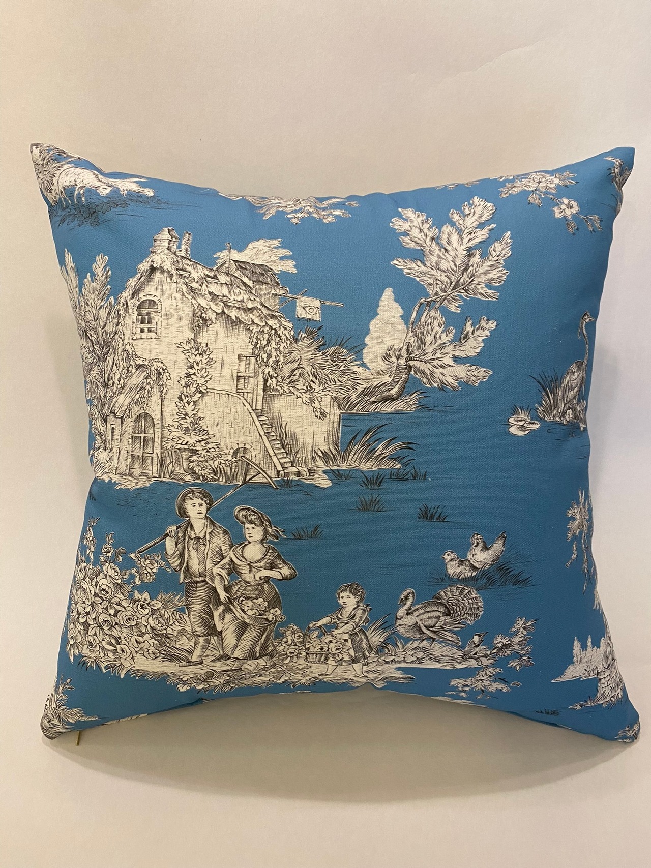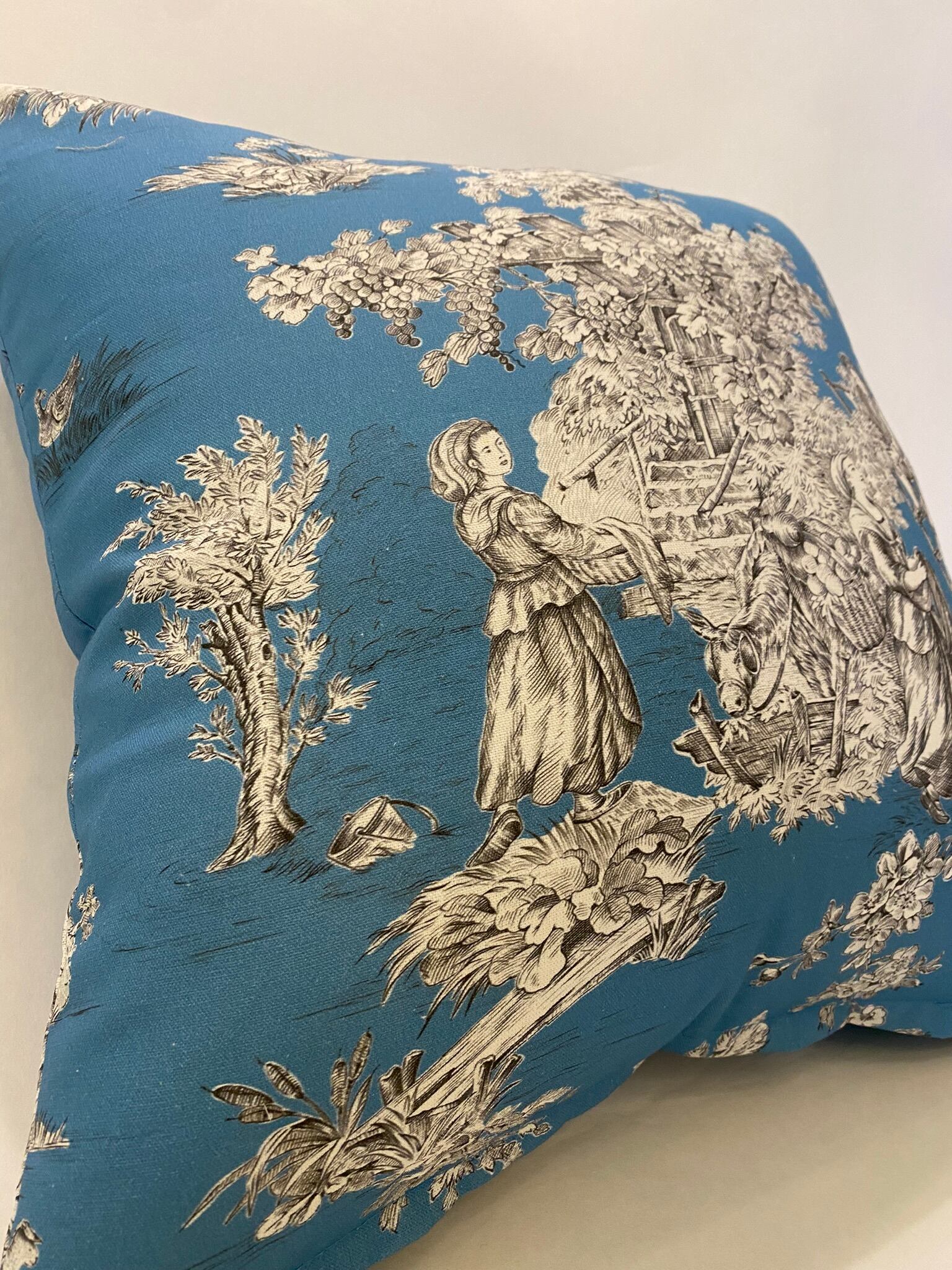 フランスのプリントメーカーmftaの生地で作ったクッションです。18世紀ごろの風景をモチーフにしたフランスの伝統的デザインのファブリックです。両面とも同じ生地です。