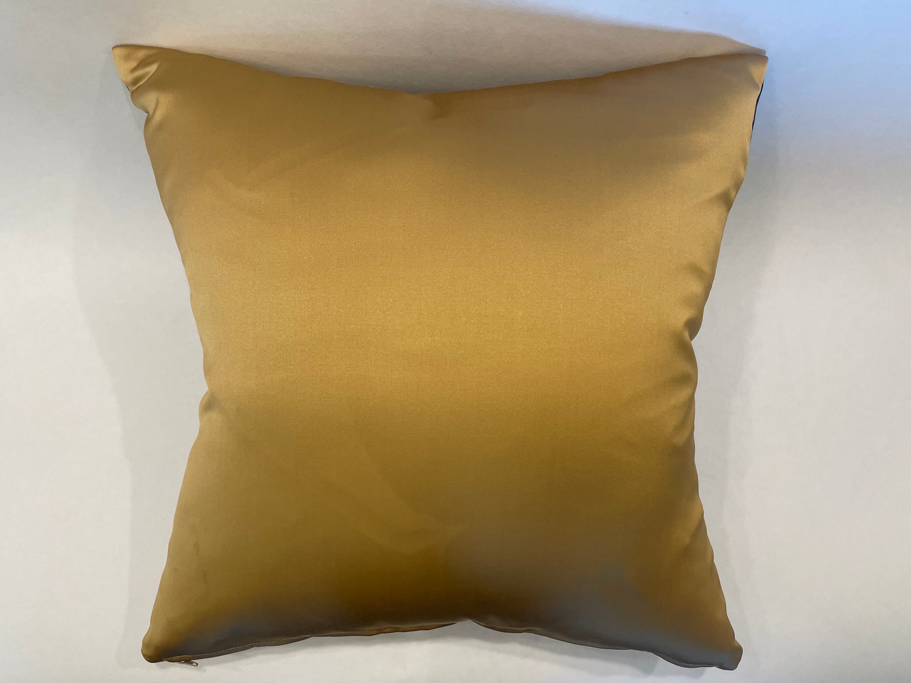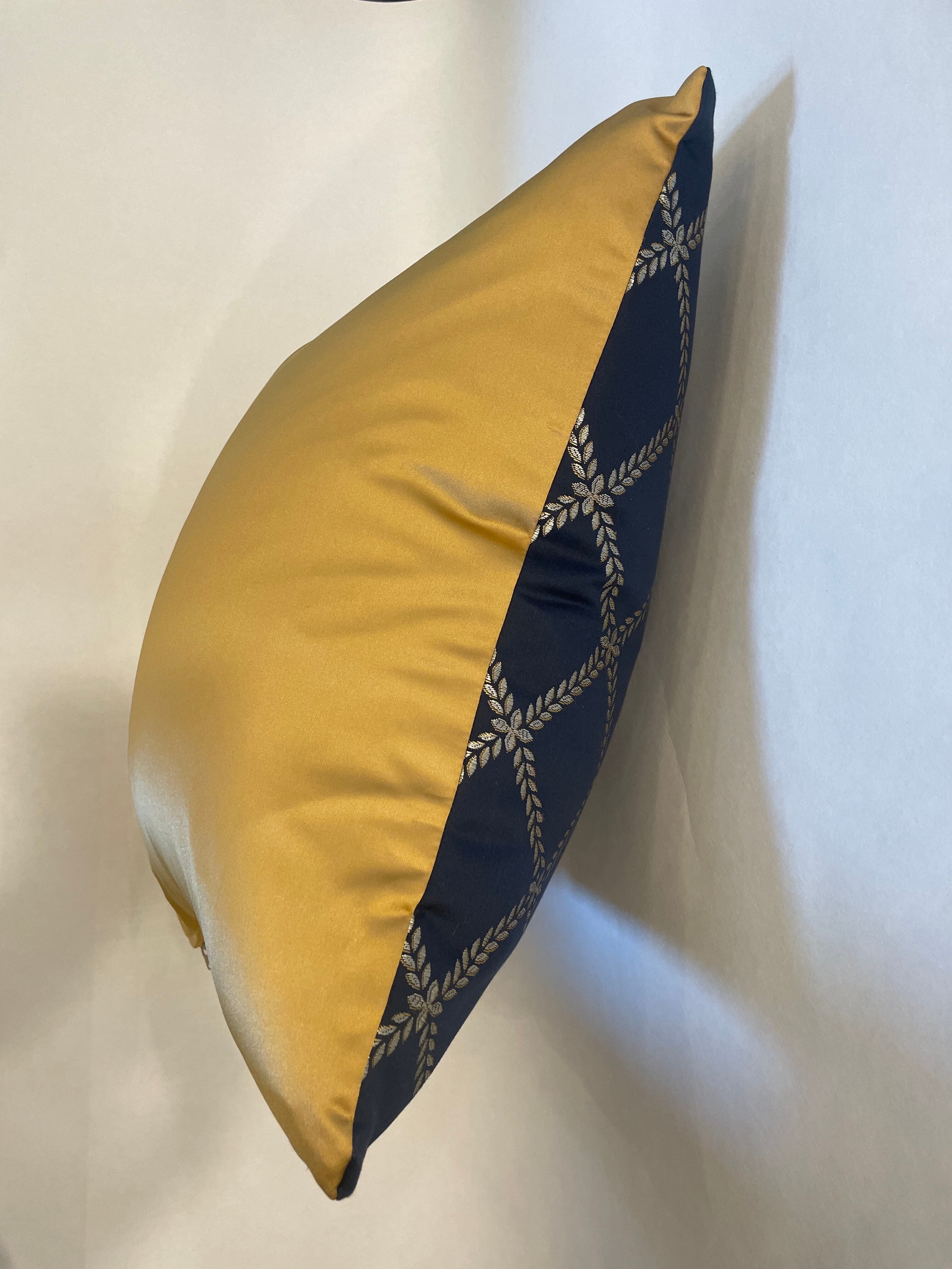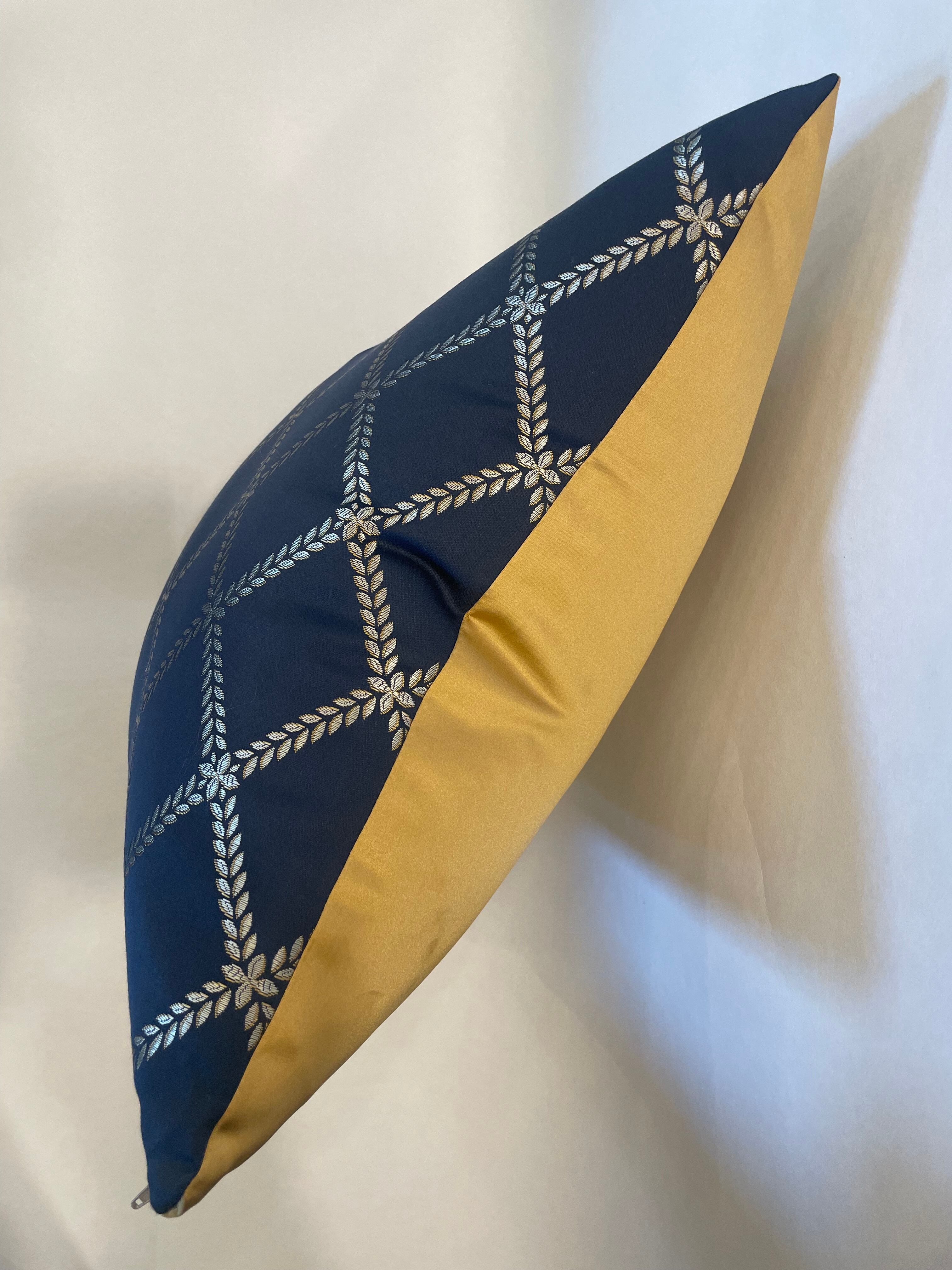 ドイツのブランド「ジャブ」の生地で作ったクッションです。裏面はポルトガルのブランド「KOBE」の光沢感のある生地を合わせた、高級感のある一点です。表地のゴールドの柄と裏地のゴールドがマッチし贅沢な仕上がりとなっています。