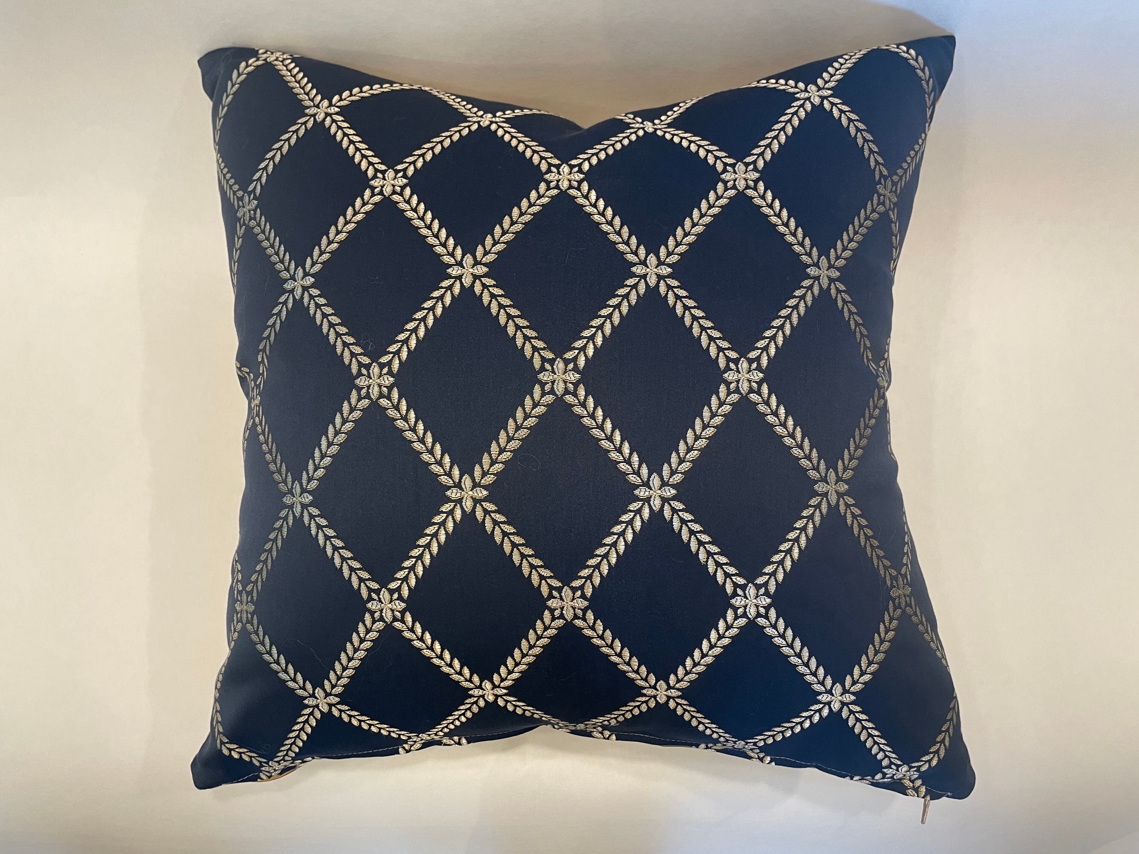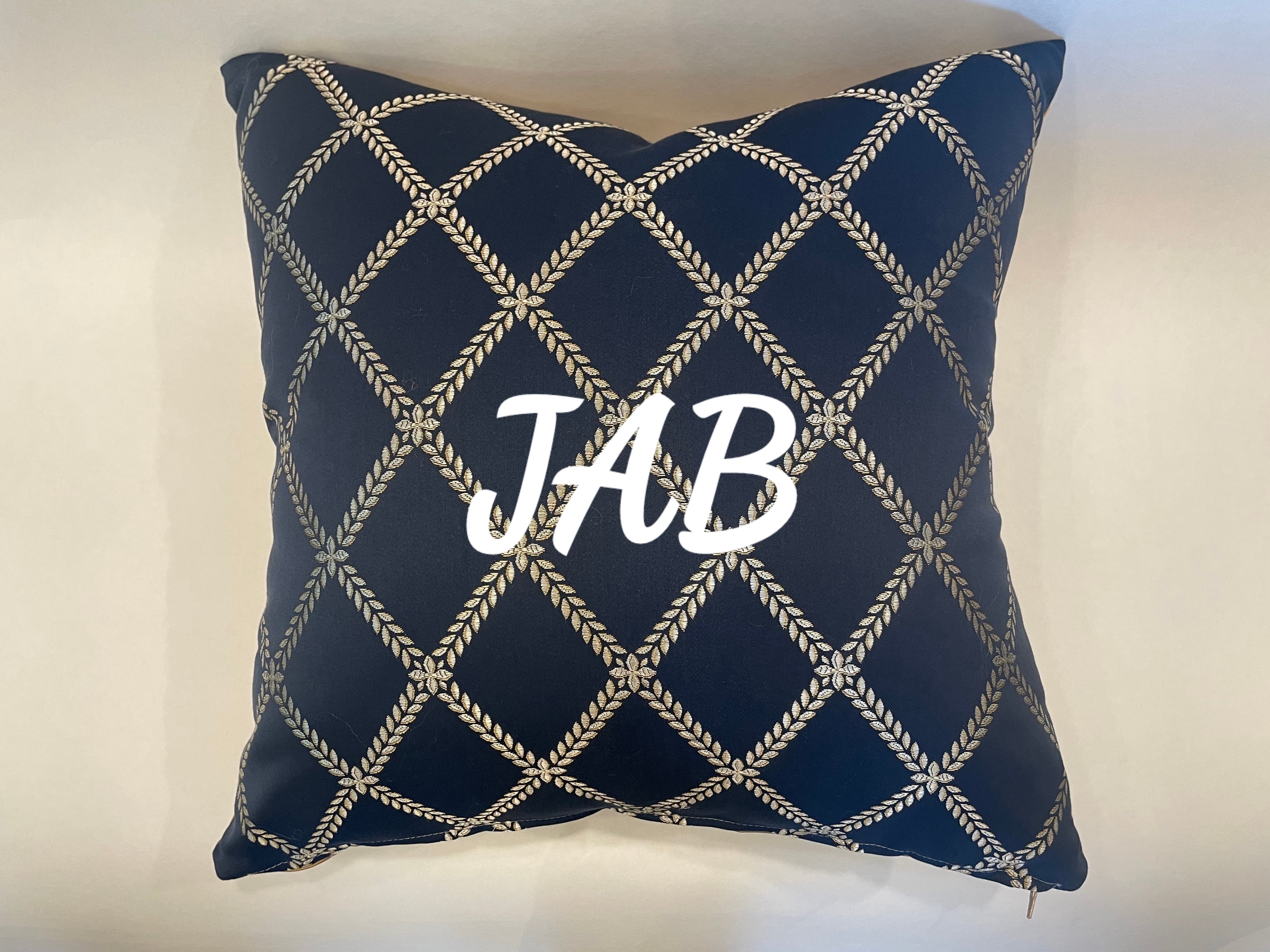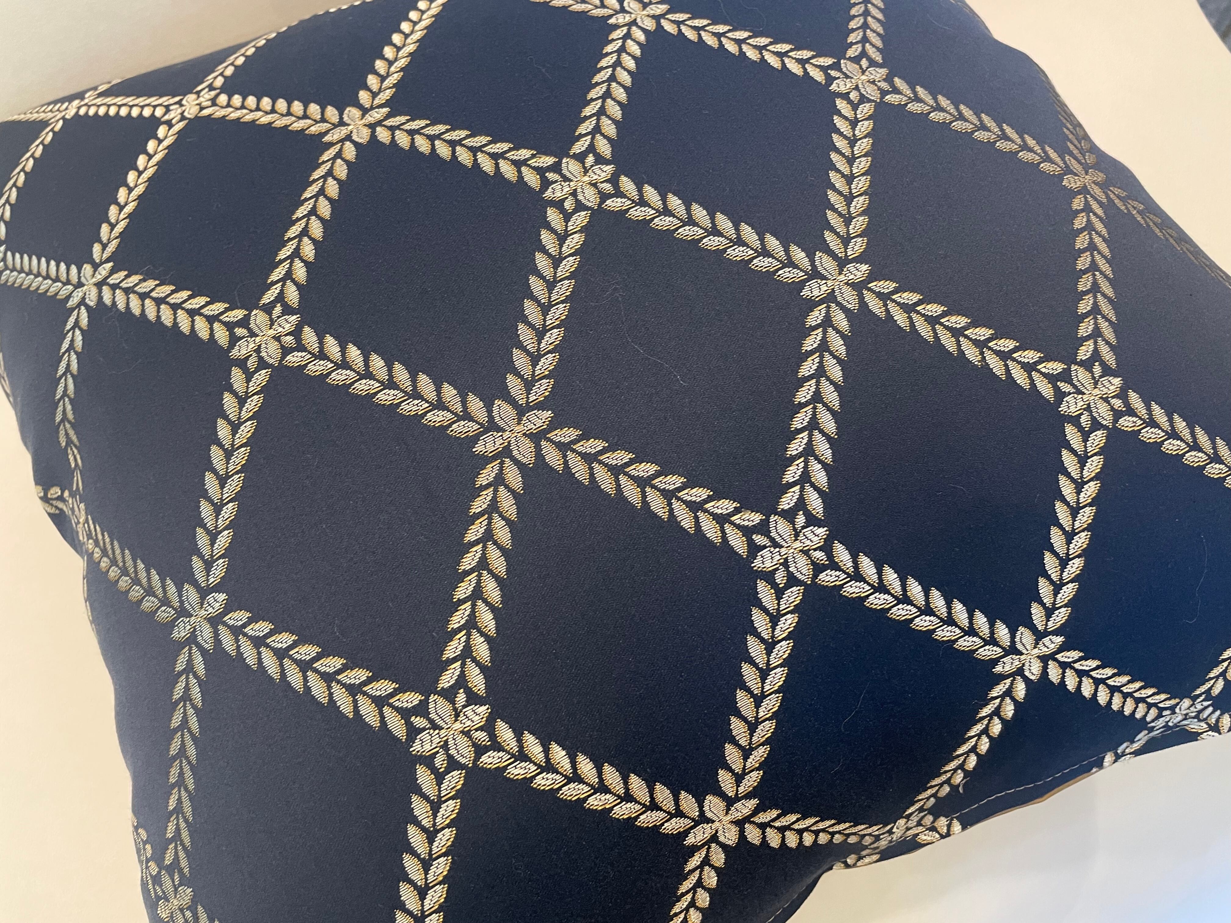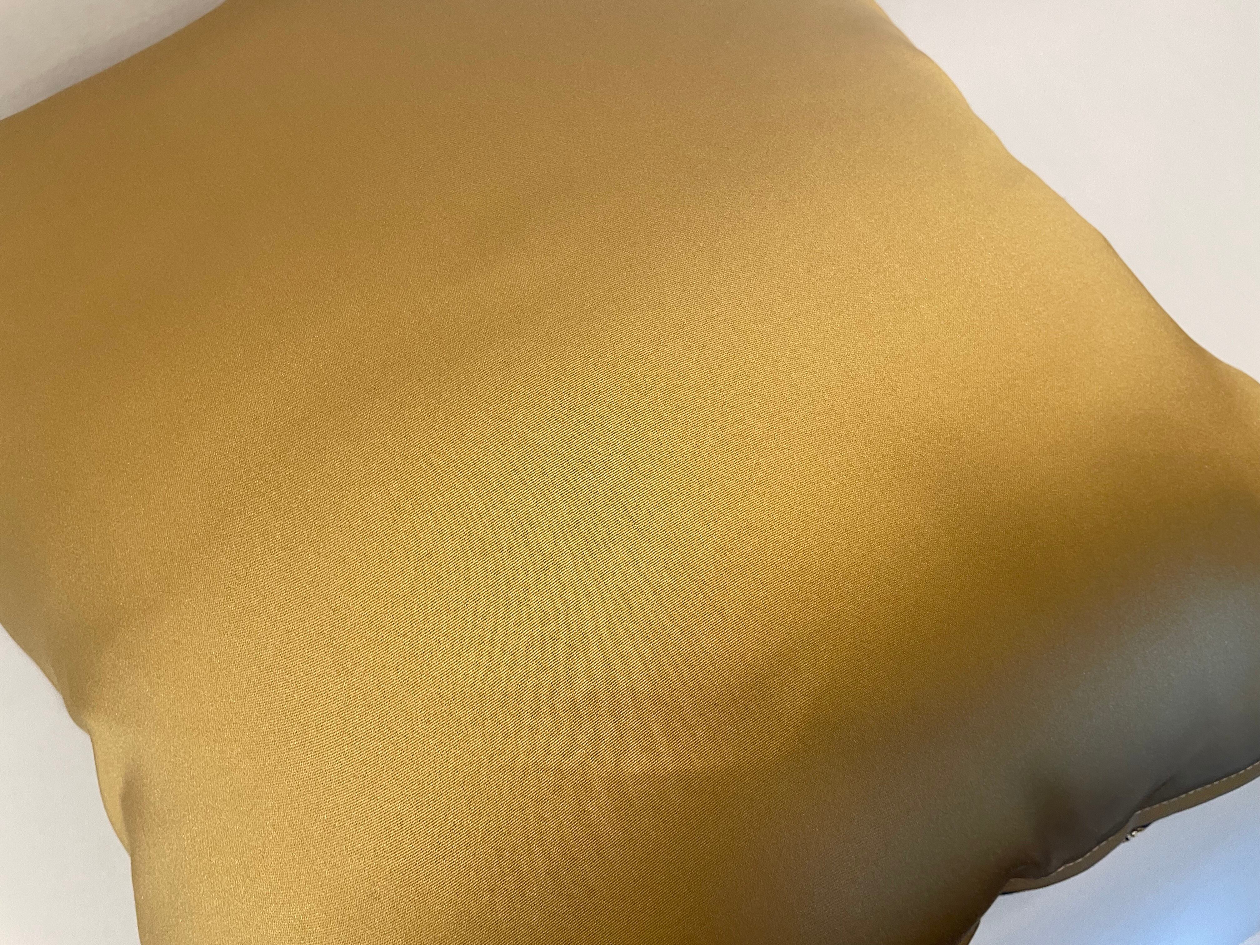 ドイツのブランド「ジャブ」の生地で作ったクッションです。裏面はポルトガルのブランド「KOBE」の光沢感のある生地を合わせた、高級感のある一点です。表地のゴールドの柄と裏地のゴールドがマッチし贅沢な仕上がりとなっています。