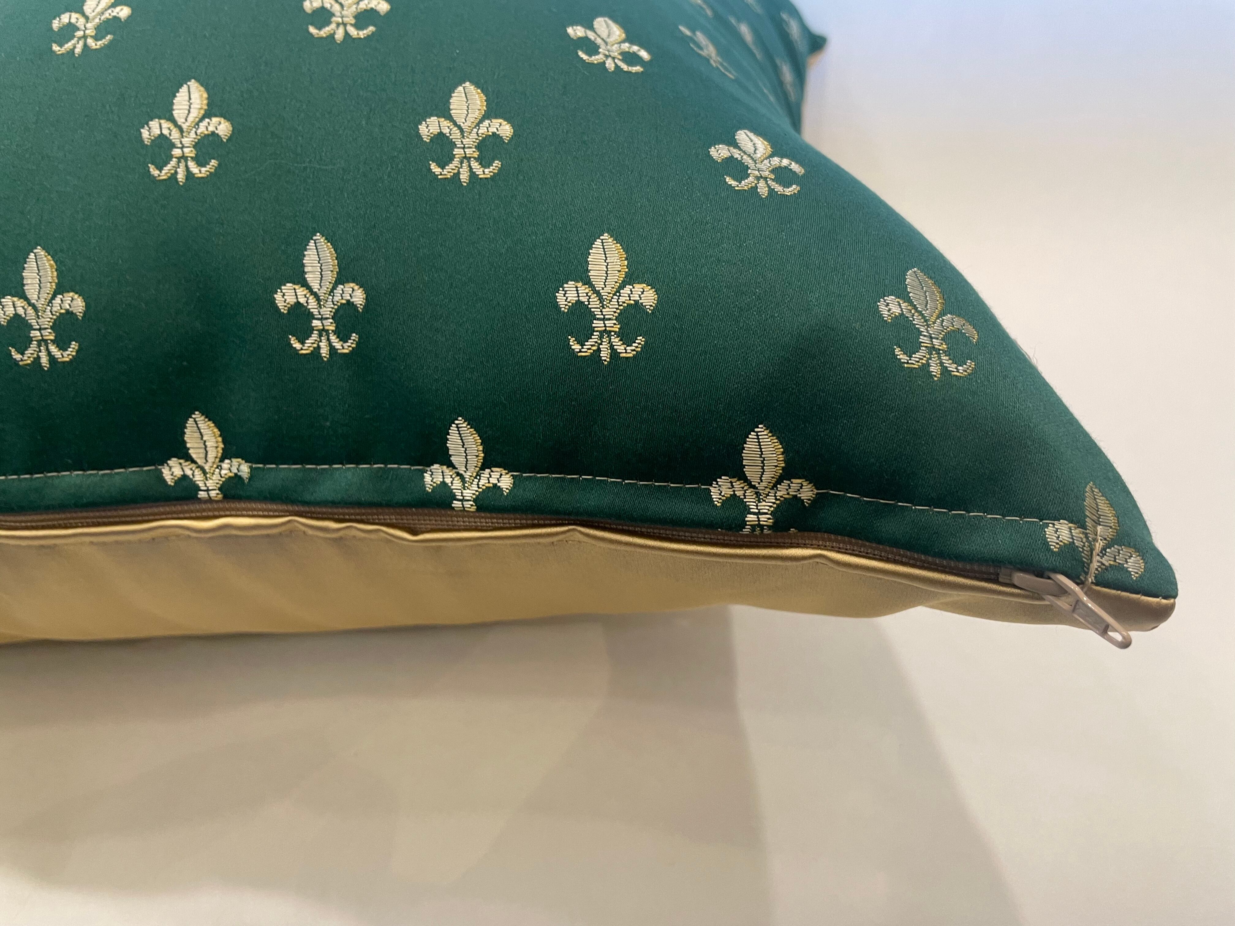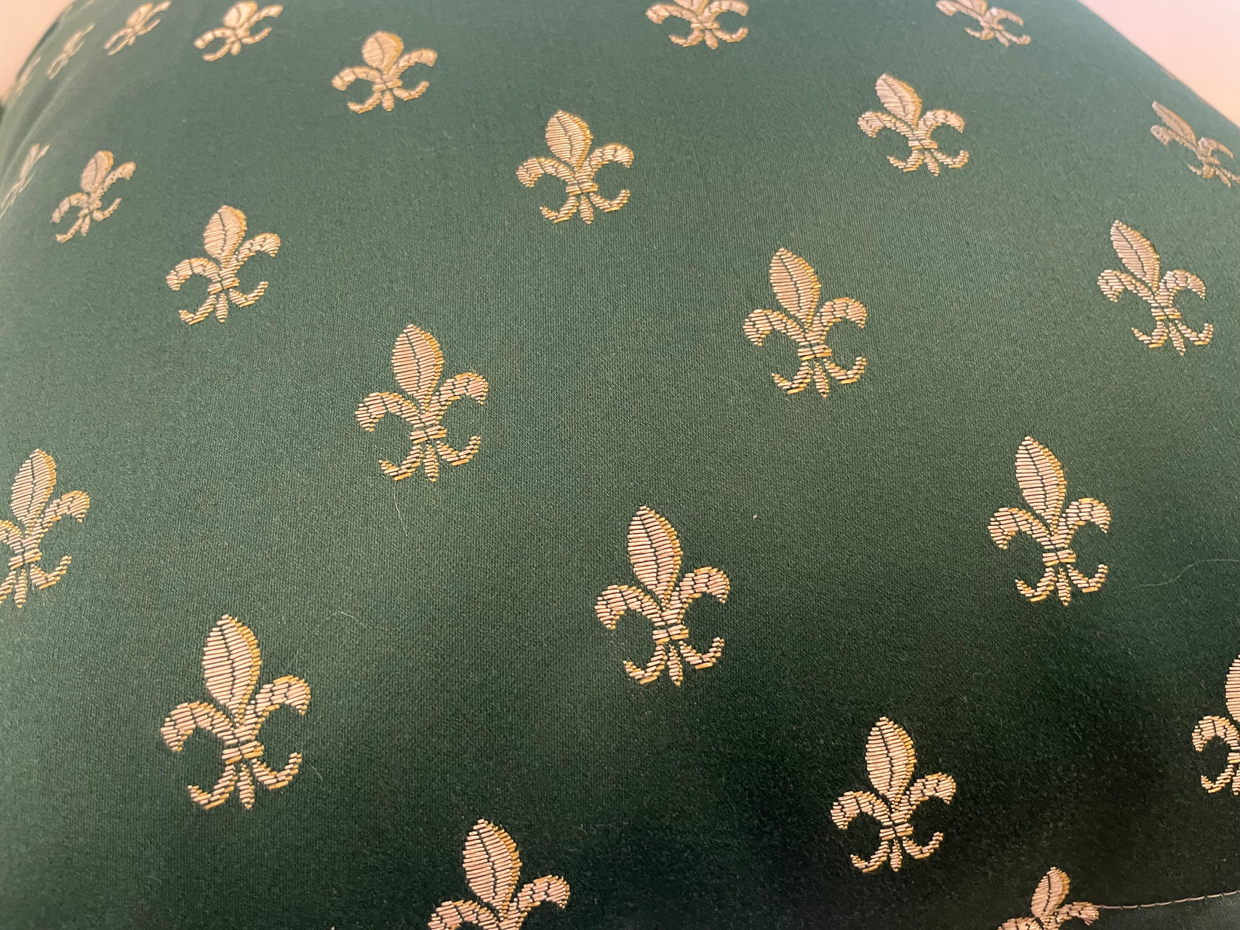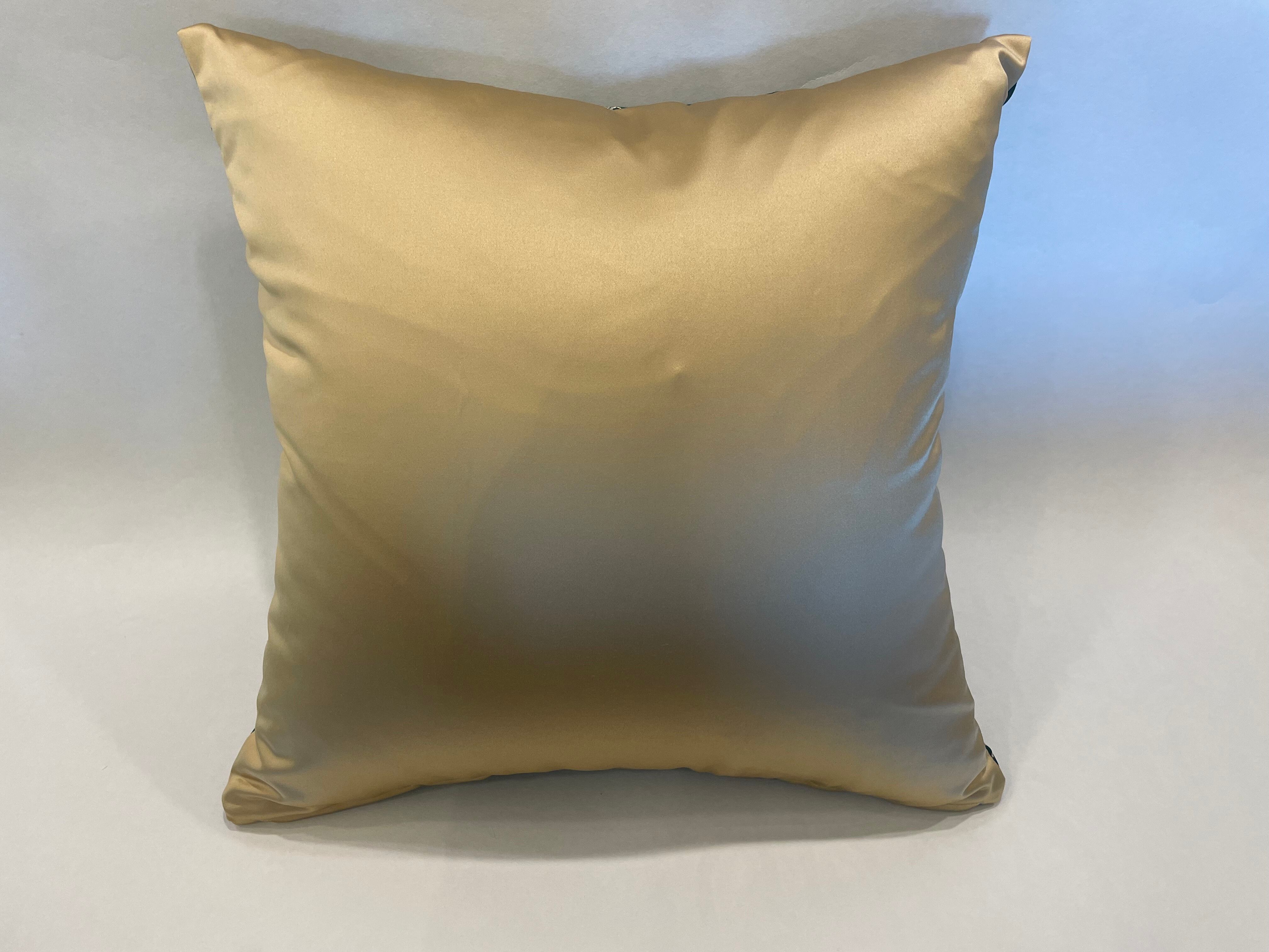 ドイツのブランド「ジャブ」の生地で作ったクッションです。裏面はポルトガルのブランド「KOBE」の光沢感のある生地を合わせた、高級感のある一点です。表地のゴールドの柄と裏地のゴールドがマッチし贅沢な仕上がりとなっています。