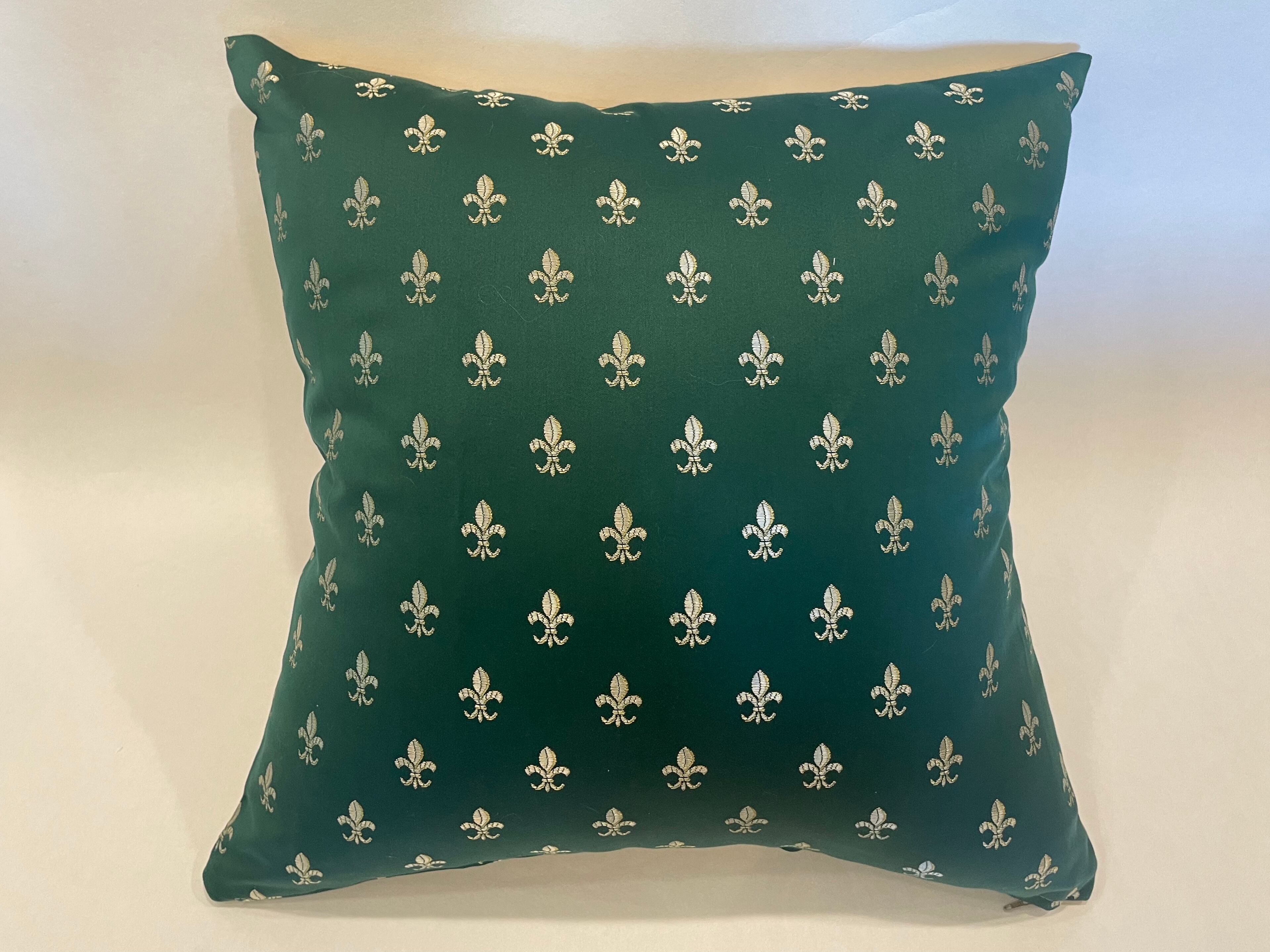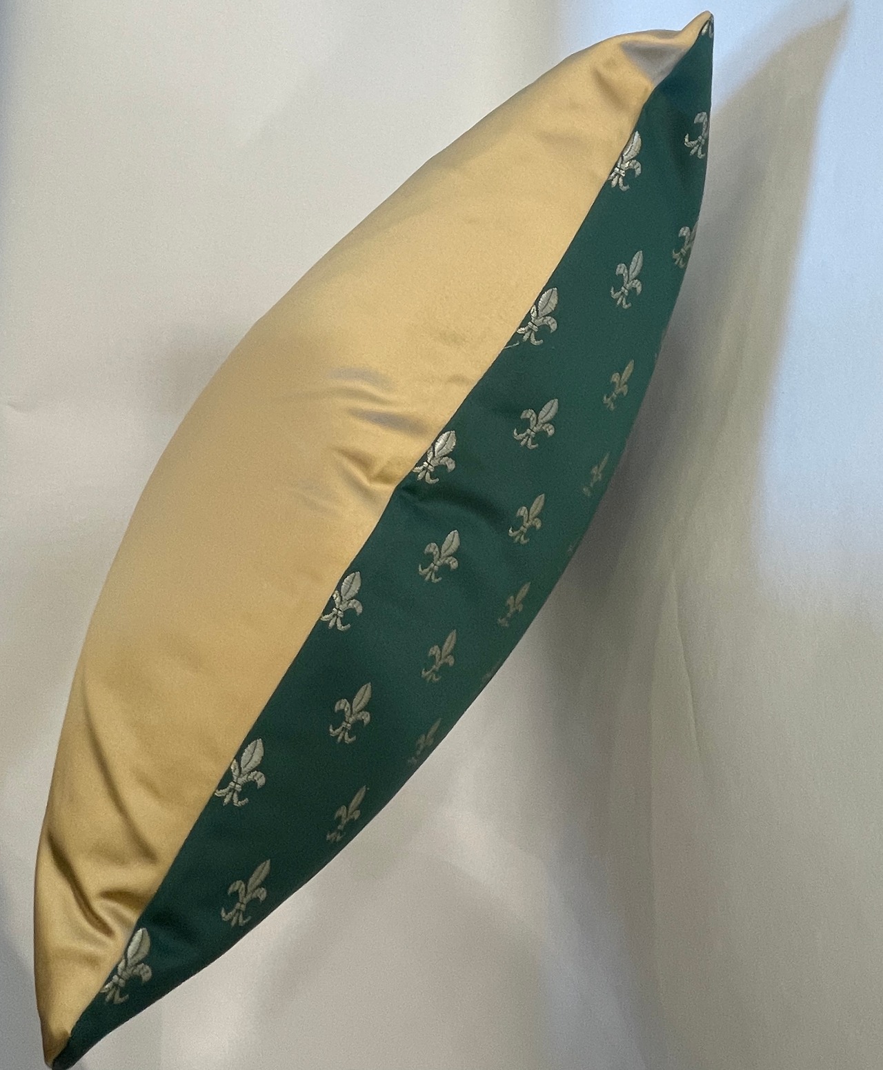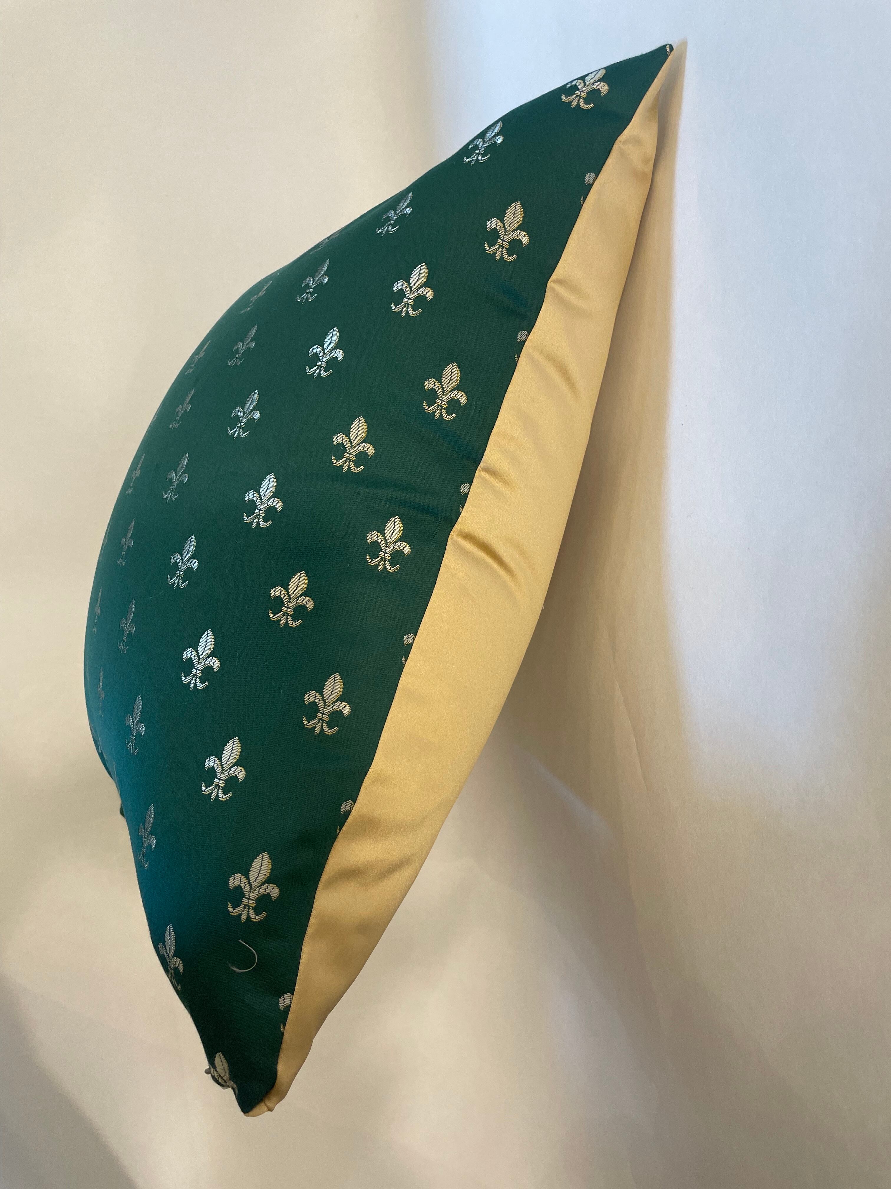 ドイツのブランド「ジャブ」の生地で作ったクッションです。裏面はポルトガルのブランド「KOBE」の光沢感のある生地を合わせた、高級感のある一点です。表地のゴールドの柄と裏地のゴールドがマッチし贅沢な仕上がりとなっています。