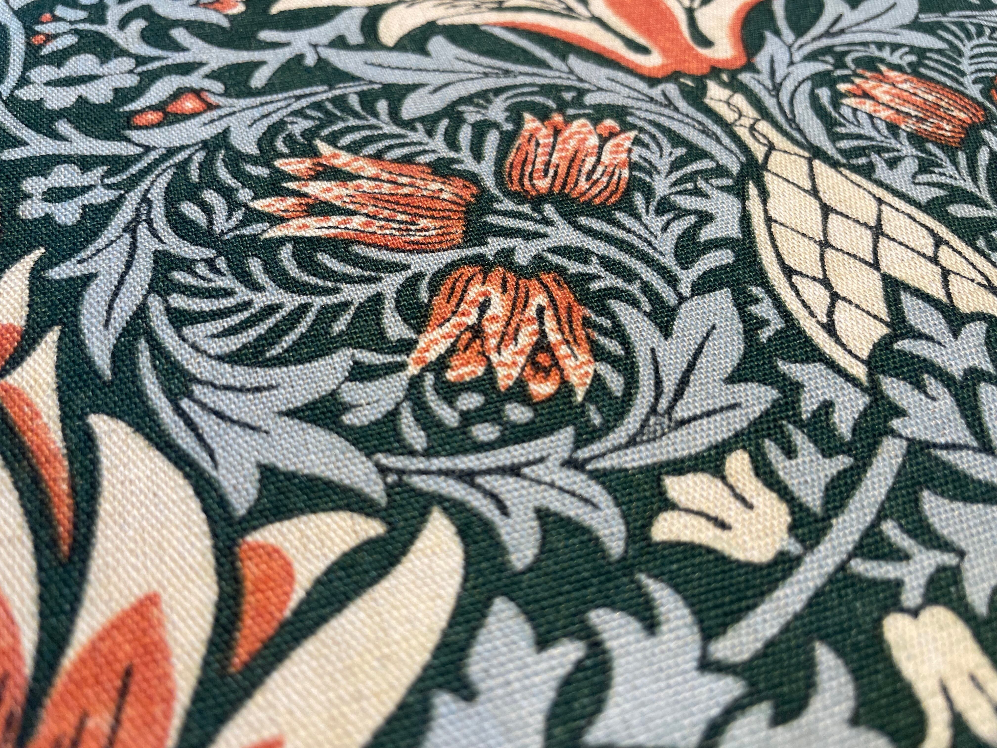 日本でも大人気の「ウィリアムモリス」の生地を表地に、綾織りの生地を裏地に使用したカバーです。モリスのデザイン性と綾織りの相性が抜群で、お部屋の差し色としてもおすすめです。