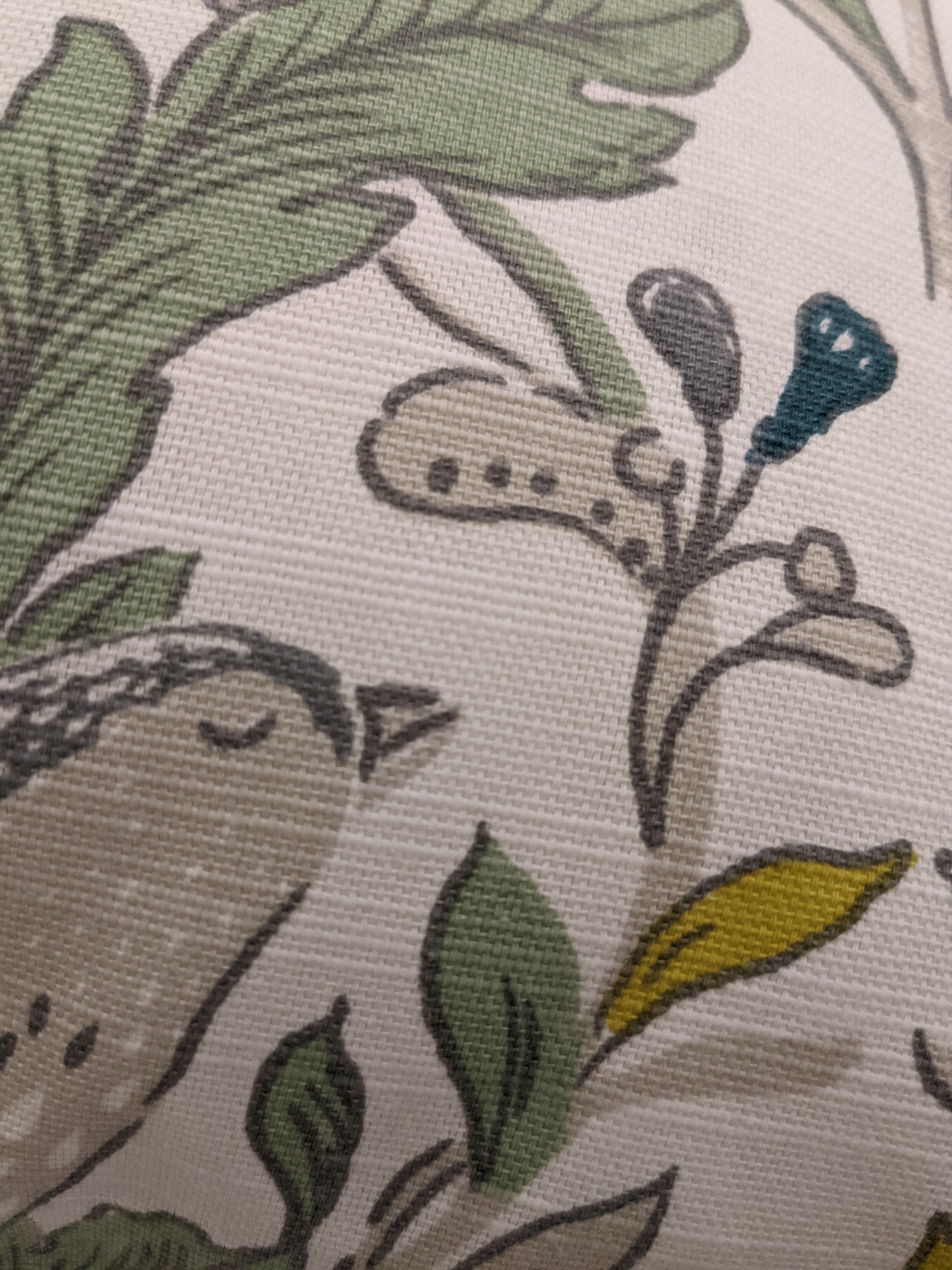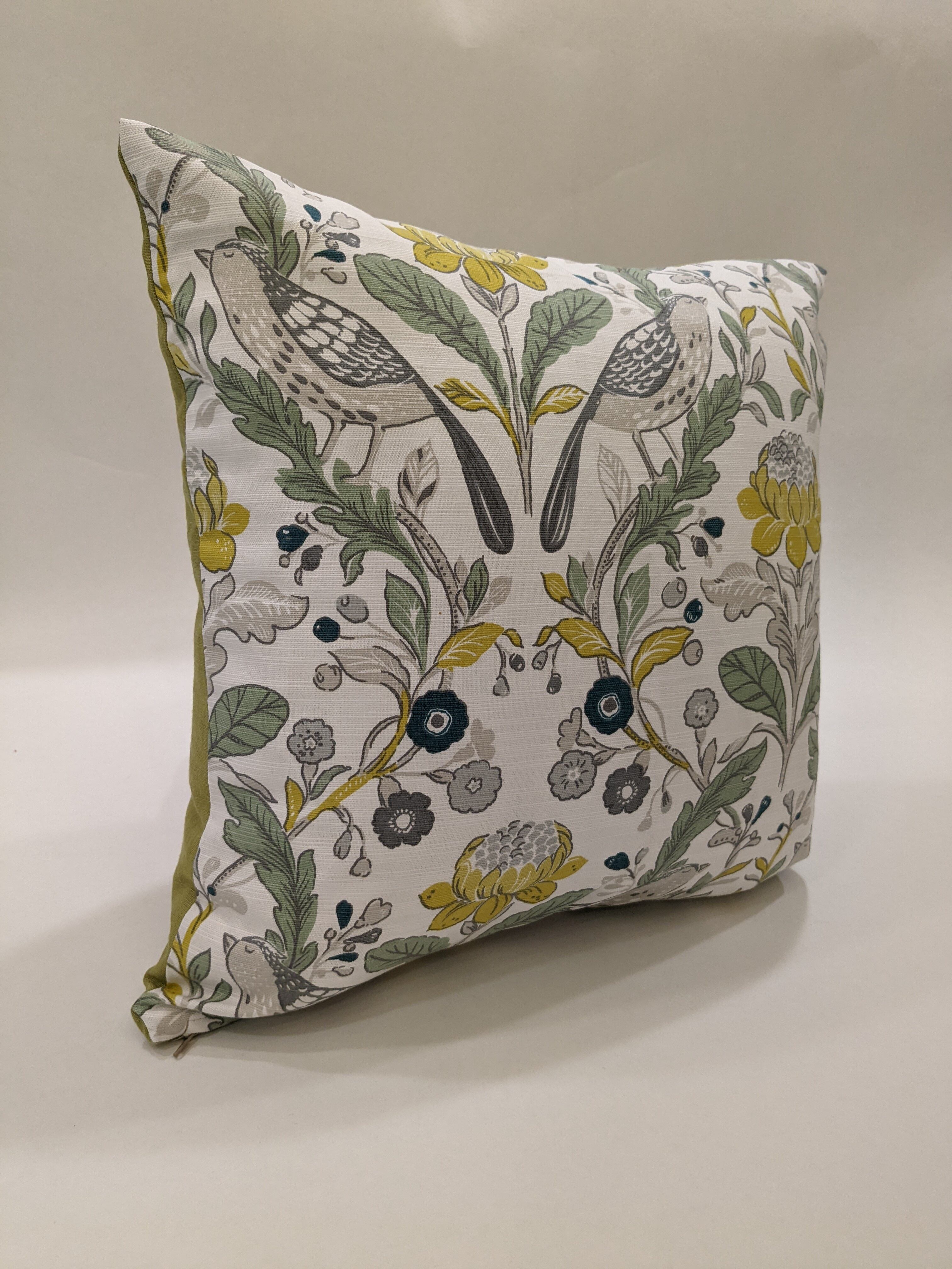 ソフトなタッチと色遣いが特徴的な「stugio g」の生地を使用しております。小鳥と草木のデザインがとても可愛らしく、インテリアのアクセントとしてもおすすめです。
